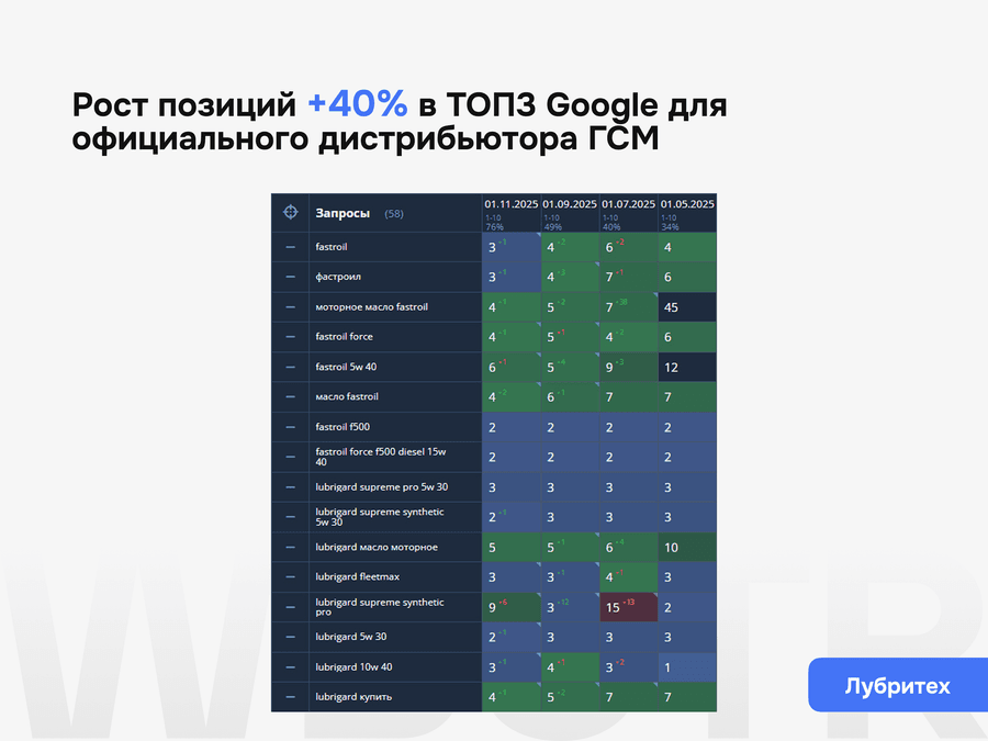 Кейс Лубри Тех: х16 рост трафика и заказы по 22 ₽ за визит из SEO