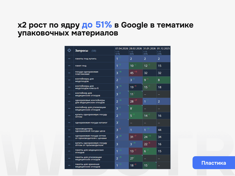 Подбираем запросы под основные направления сайта, очищаем и группируем их по интенту, приоритету и коммерческой ценности, чтобы строить продвижение не вокруг абстрактного ядра, а вокруг реальных точек роста.