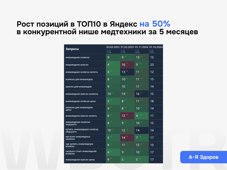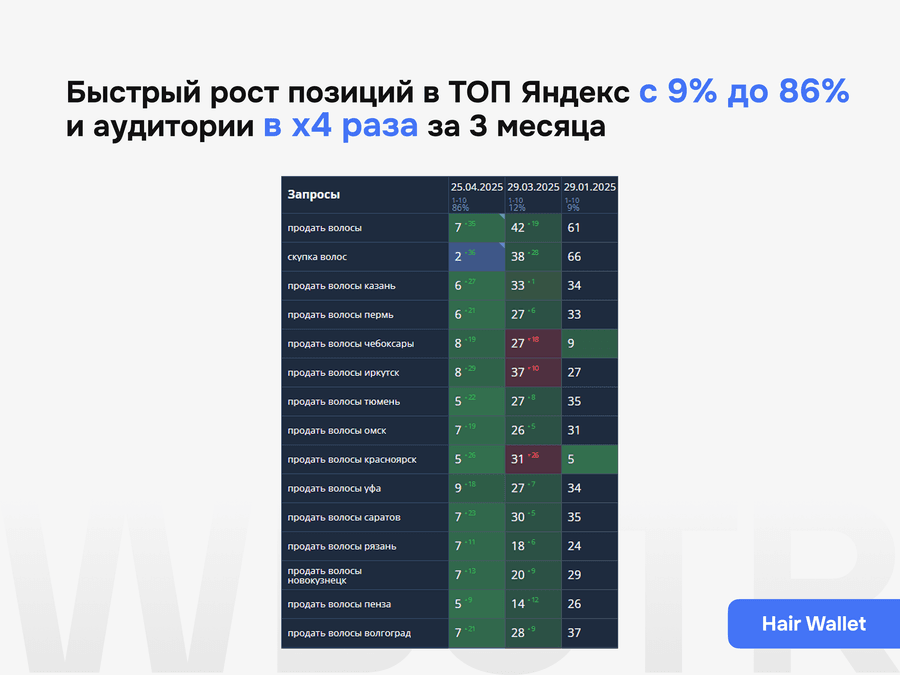 На основе фактической динамики пересматриваем приоритеты: усиливаем перспективные страницы, дорабатываем слабые разделы, корректируем структуру и контент там, где сайт недобирает результат.